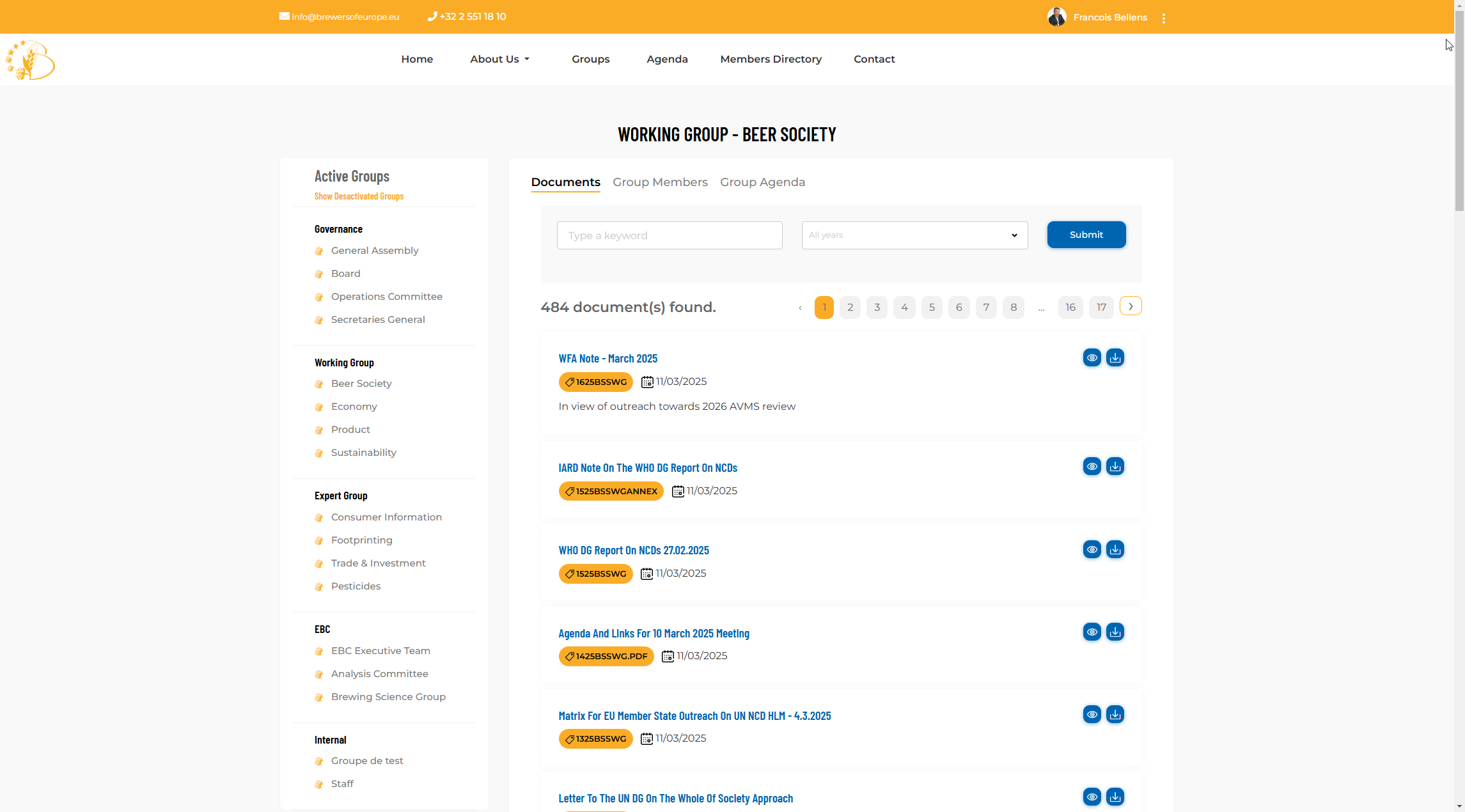 • A list of the latest documents released within all the groups. The title of each document is clickable and directs users to the detailed document screen within the relevant group. By clicking the two blue icons on the right side, users can either preview the attached file in a new tab or download it directly to their computer with a single click. Please note that if a document contains multiple attachments, the download will be a ZIP archive bundling all attachments together.